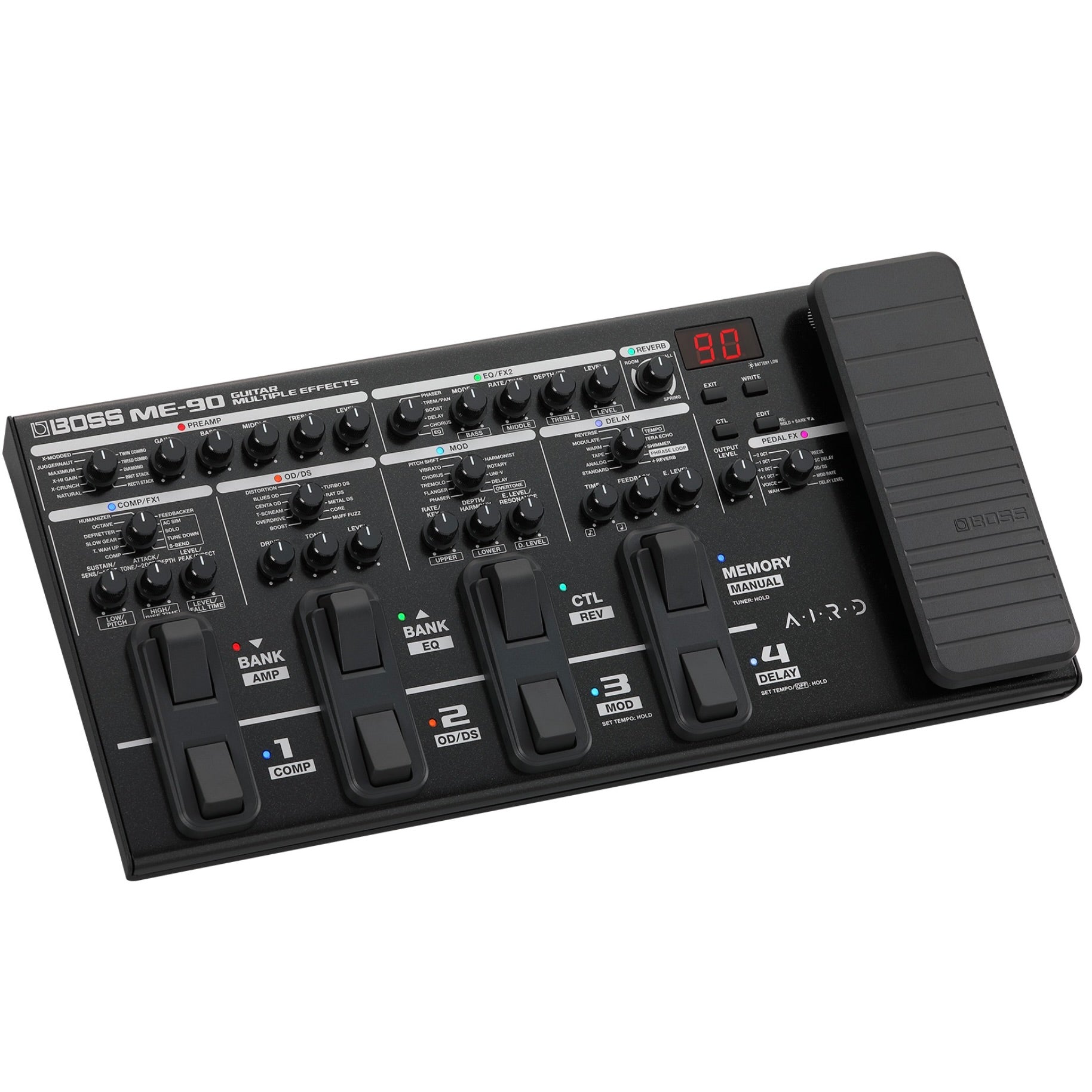 The ME-90 features eight footswitches with smooth, quiet operation and an expression pedal with an integrated toe switch. Use Memory mode to call up complete patch setups with the footswitches, and then switch to Manual mode for direct on/off control of each effect category within the patch. The footswitch LEDs light in different colors for quick identification in the heat of a performance. It’s also possible to set all LEDs to light in a fixed color for each mode if desired.