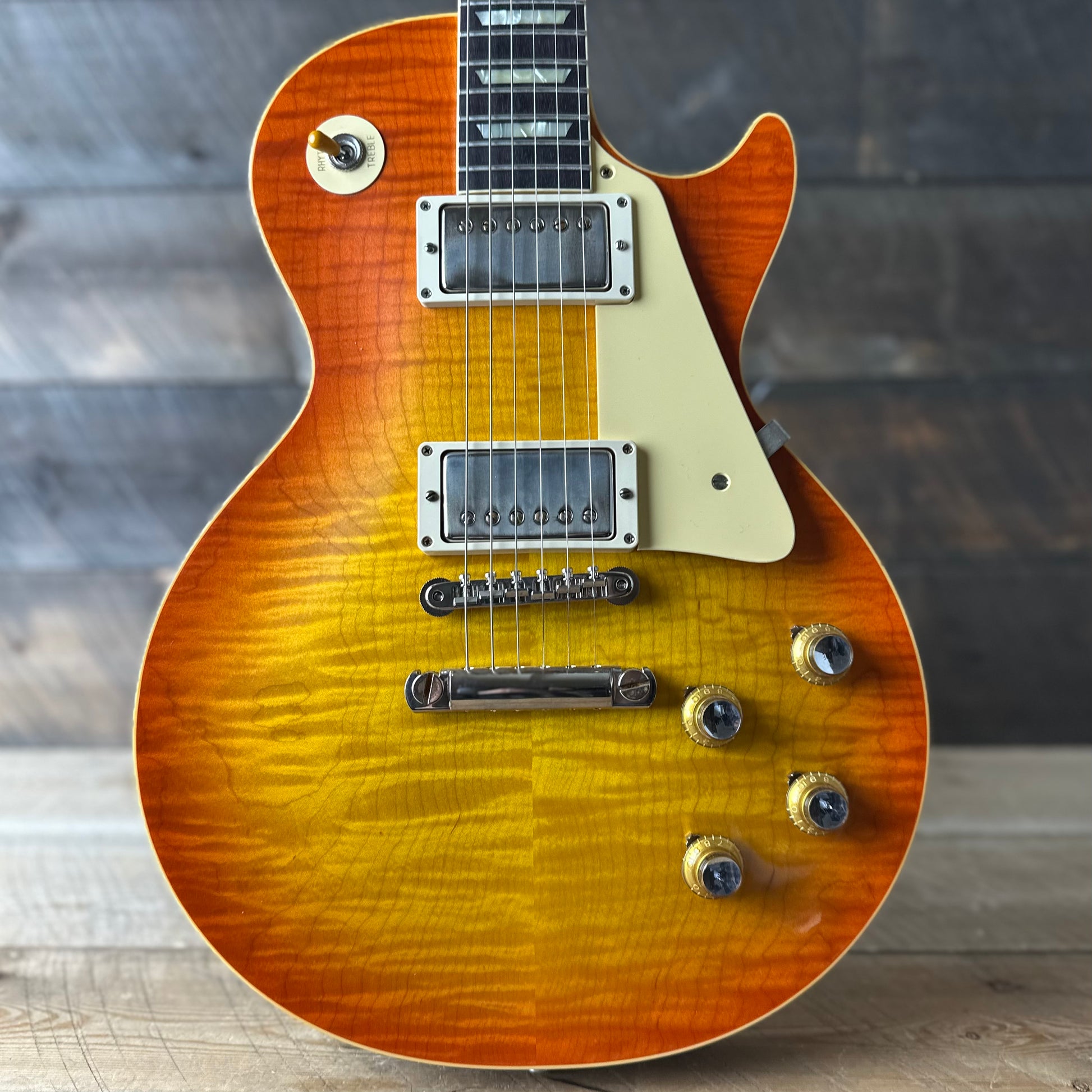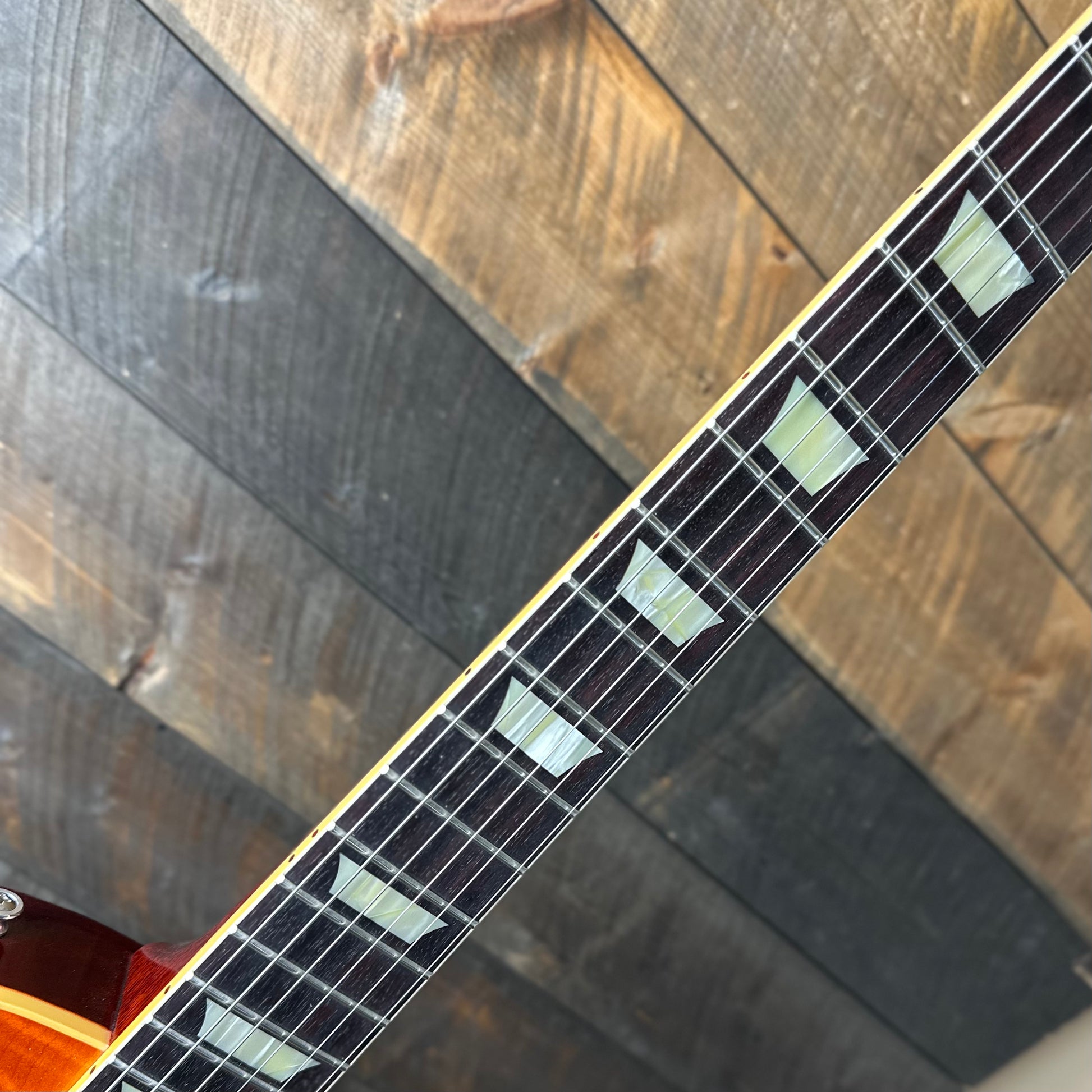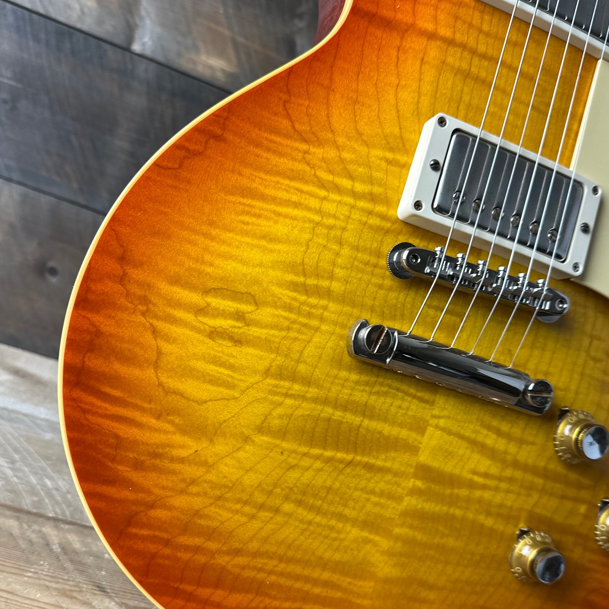 Such a beautiful top on this one—the Tangerine Burst really brings out all the unique figuring patterns. This guitar looks and feels alive.