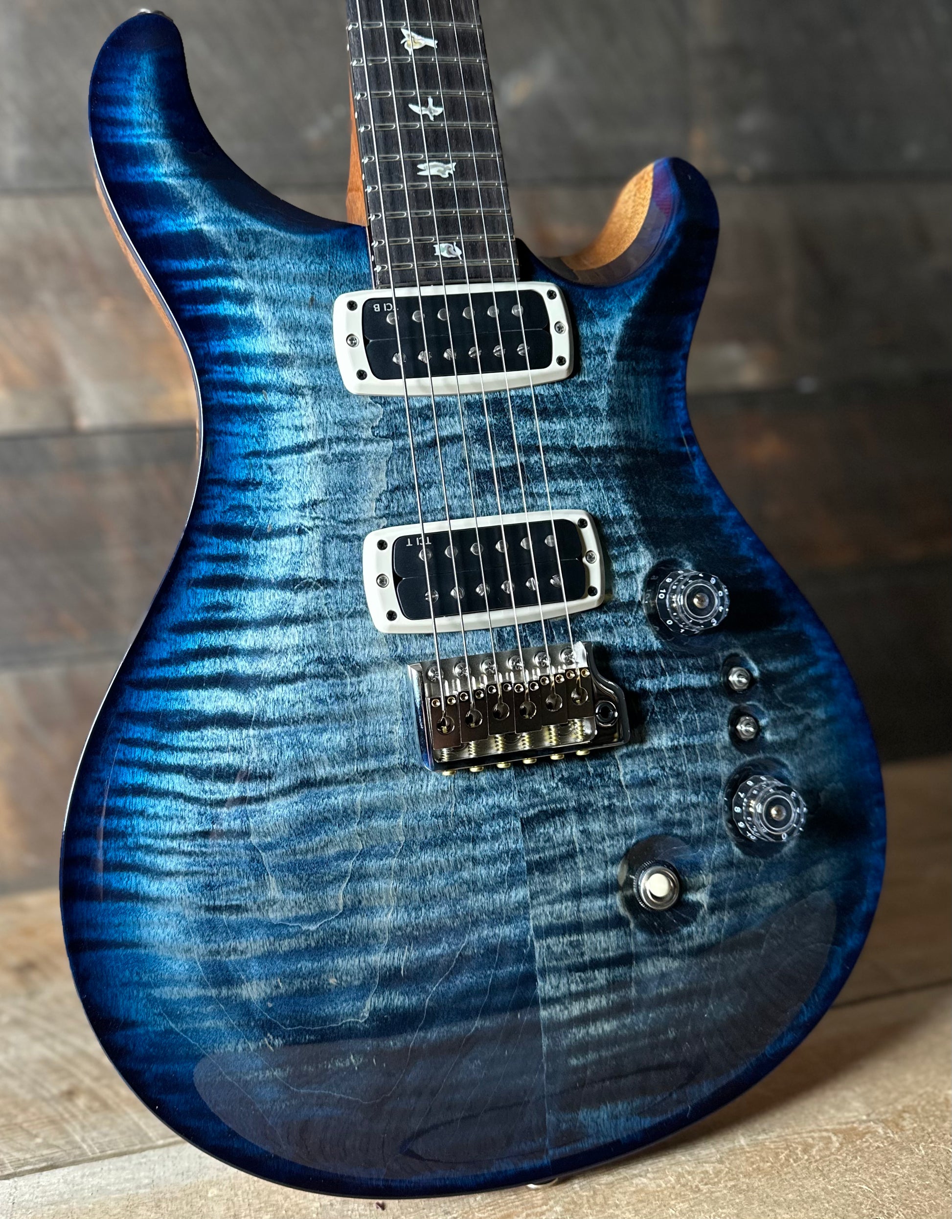 This is one of our favorite burst finishes from PRS. The rich blue is a wonderful complement to the natural back.