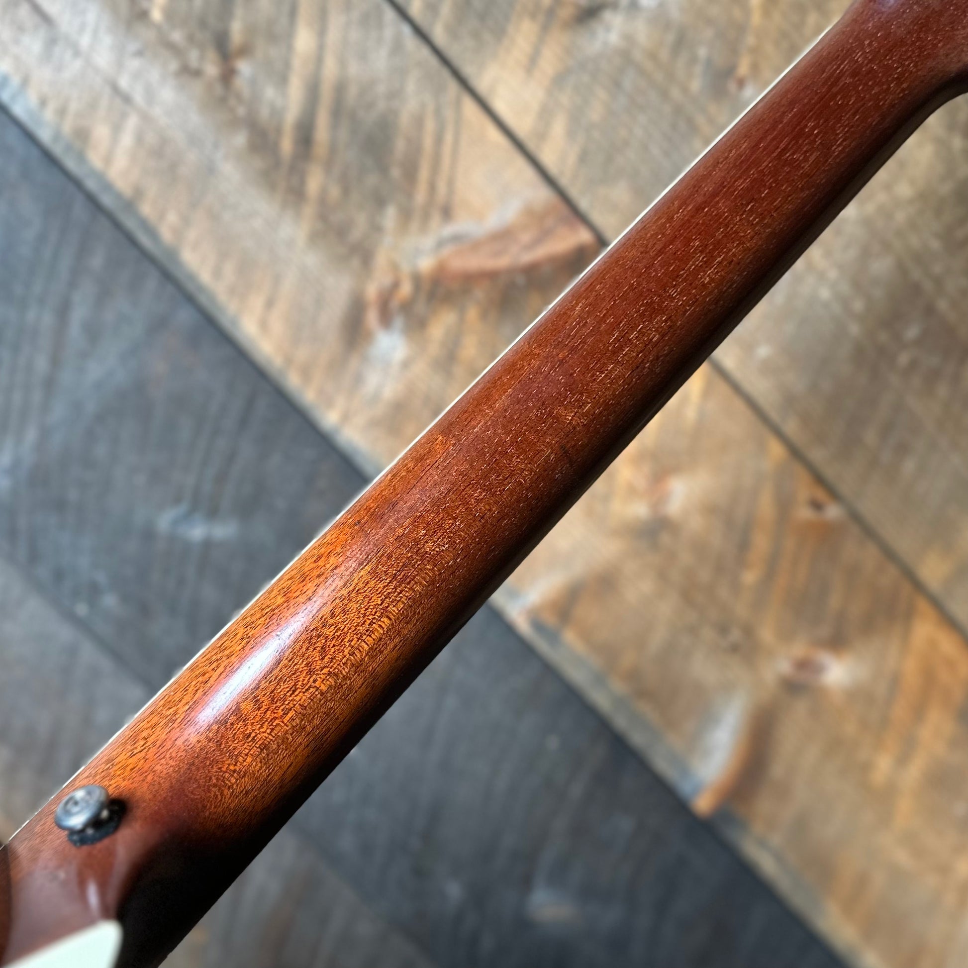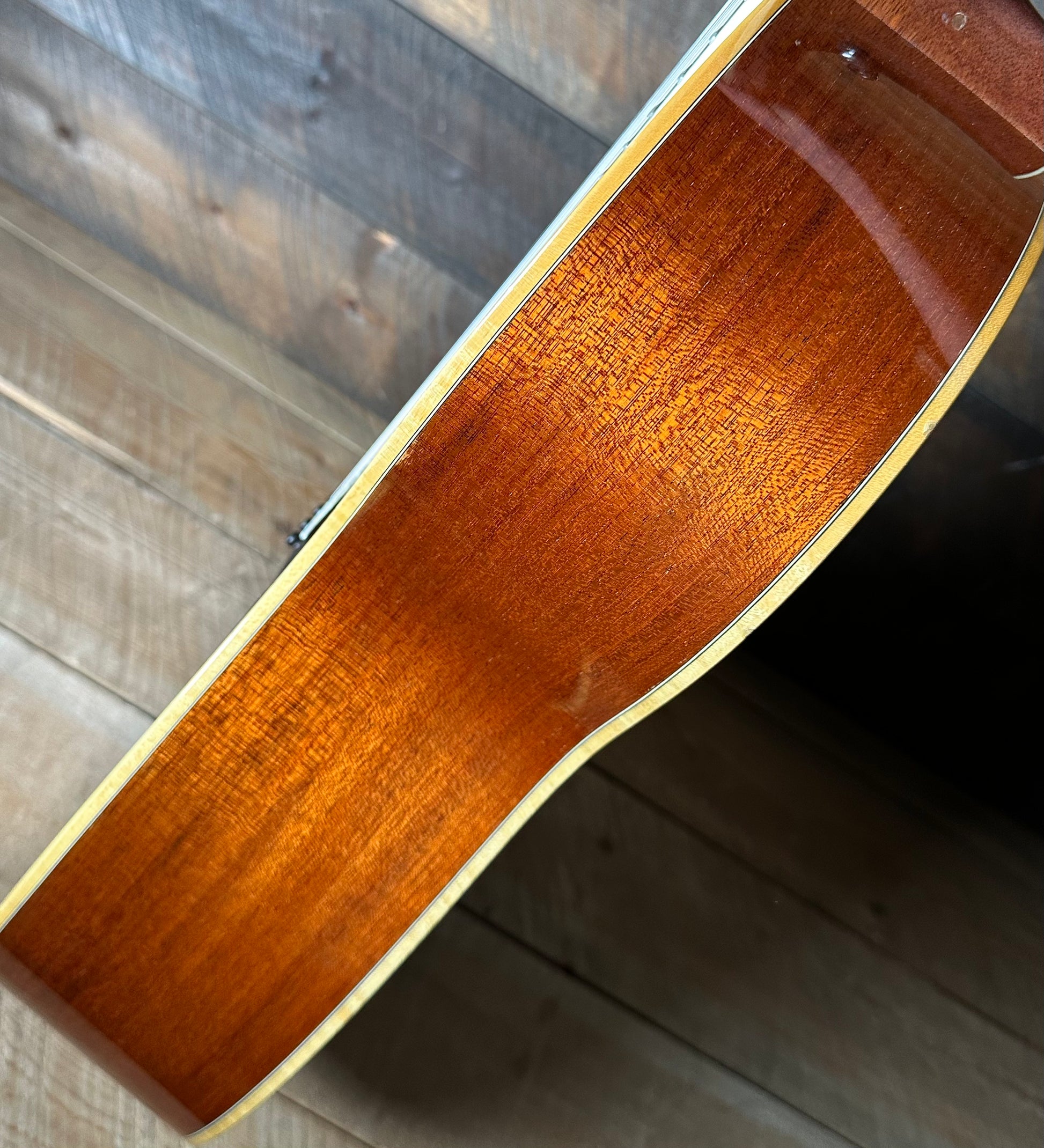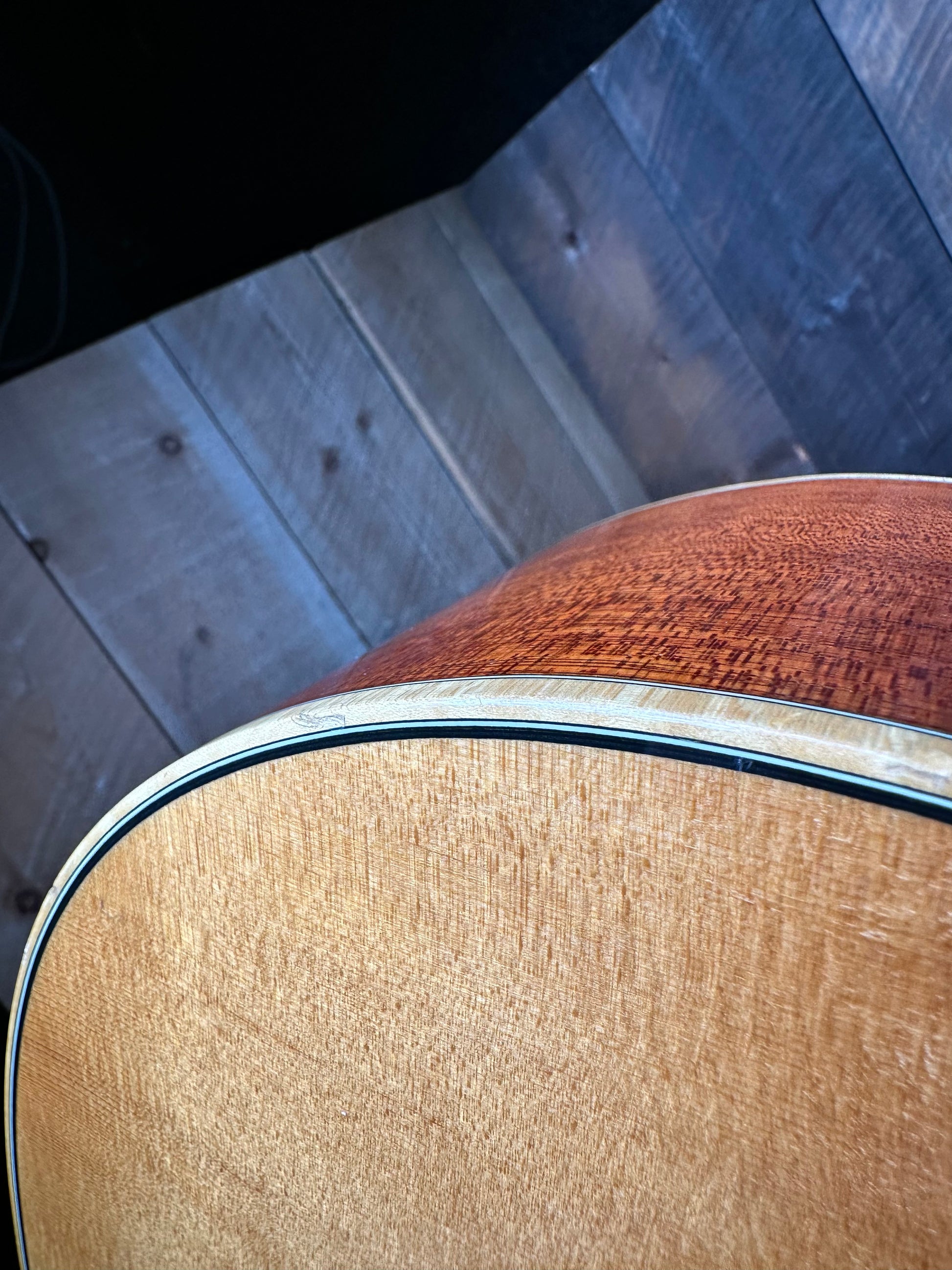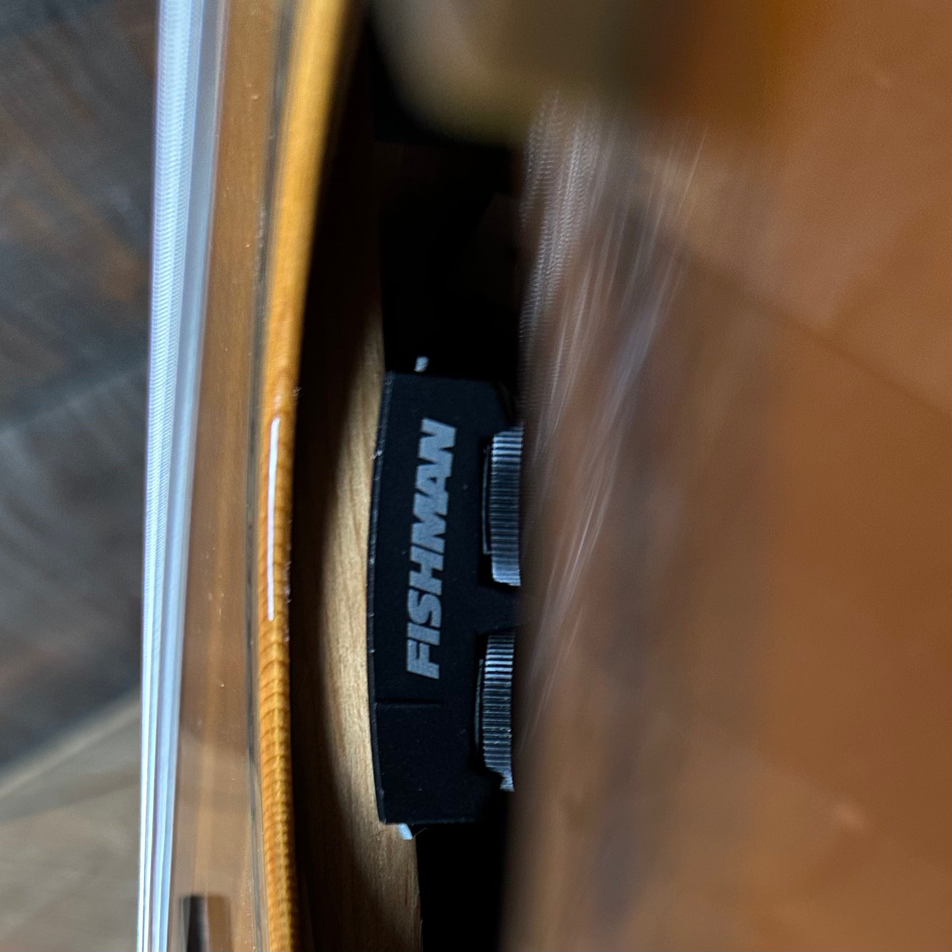 There where two modifications to this guitar one being the strap button on the neck was installed/ relocated. There is a screw hole where the strap button used to be that was professionally filled. The second modification is a great Fishman Matrix Infinity Pickup. Its minimally invasive with a small control panel mounted beneath the sound-hole.