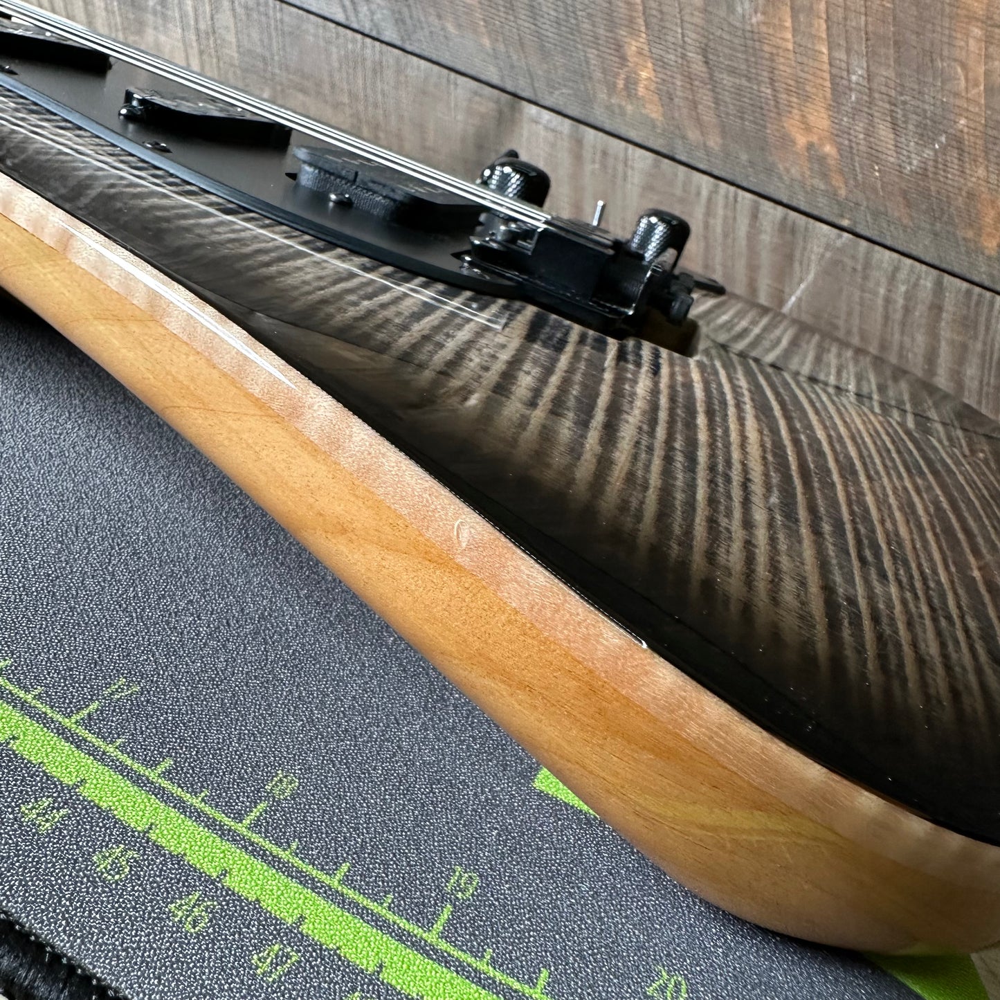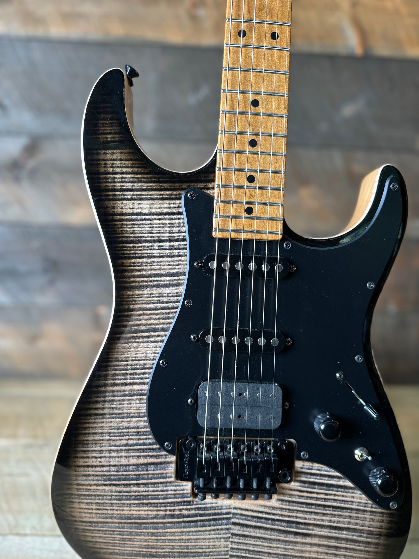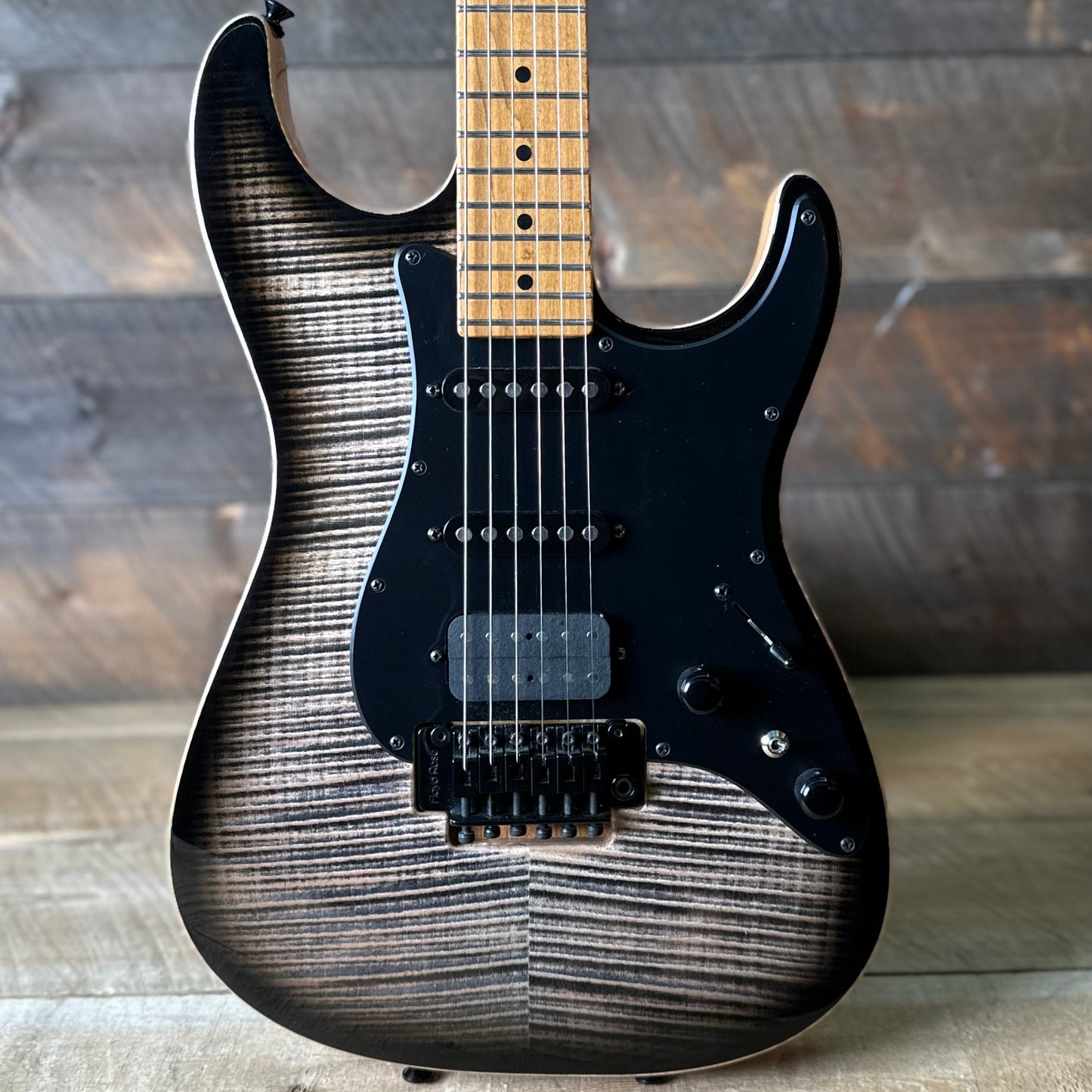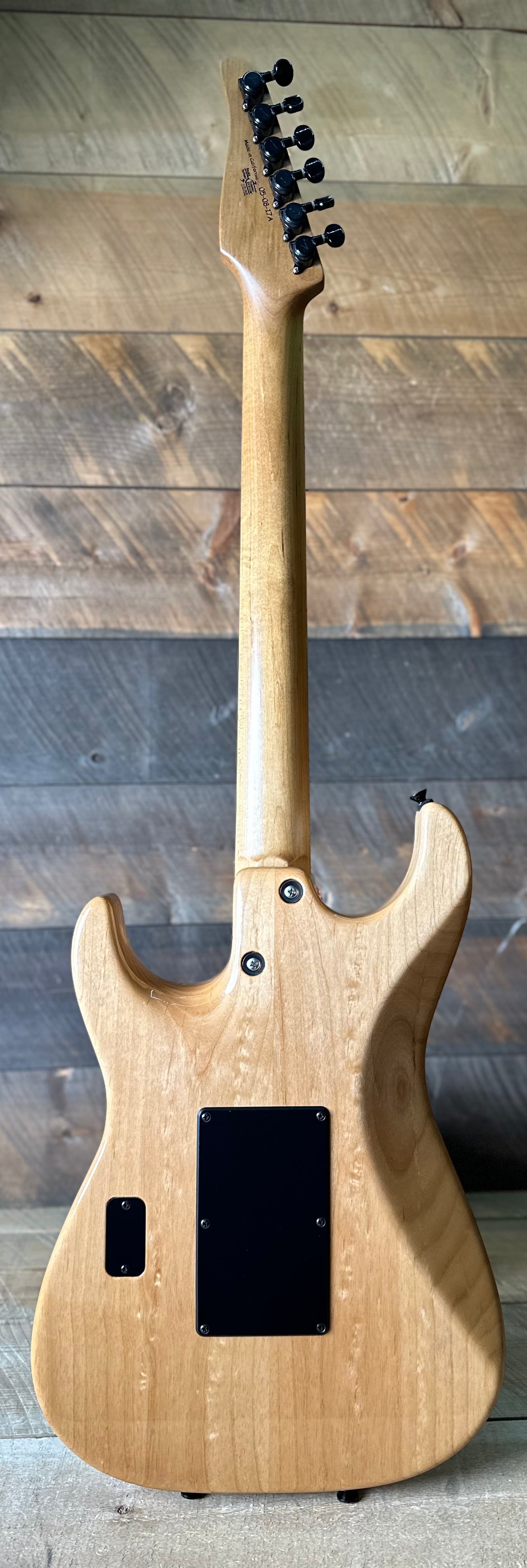 This Drop Top Classic just arrived at Quimper Sound in excellent shape!! If your looking for a guitar that does it all, well the look no further. The HSS pickup configuration is paired with a versatile control layout with coil split for the humbucker and VA booster switch. This guitar is lightweight, made up by a carefully selected alder body, high grade flame maple top, and Caramel maple neck. To top it all off theres a Floyd Rose mini trem that only locks on the bottom, its a great incredibly stable tremolo without the added hassle of locking nut. Conditionally speaking this guitar only has hardly any signs of wear. One tiny ding on the binding, maybe some slight scratches or smudges we missed but seriously this could almost be considered new. Overall one of the coolest super-strats money can buy with extreme versatility, unrivaled playability, and master craftsmanship. The original hard case is included!